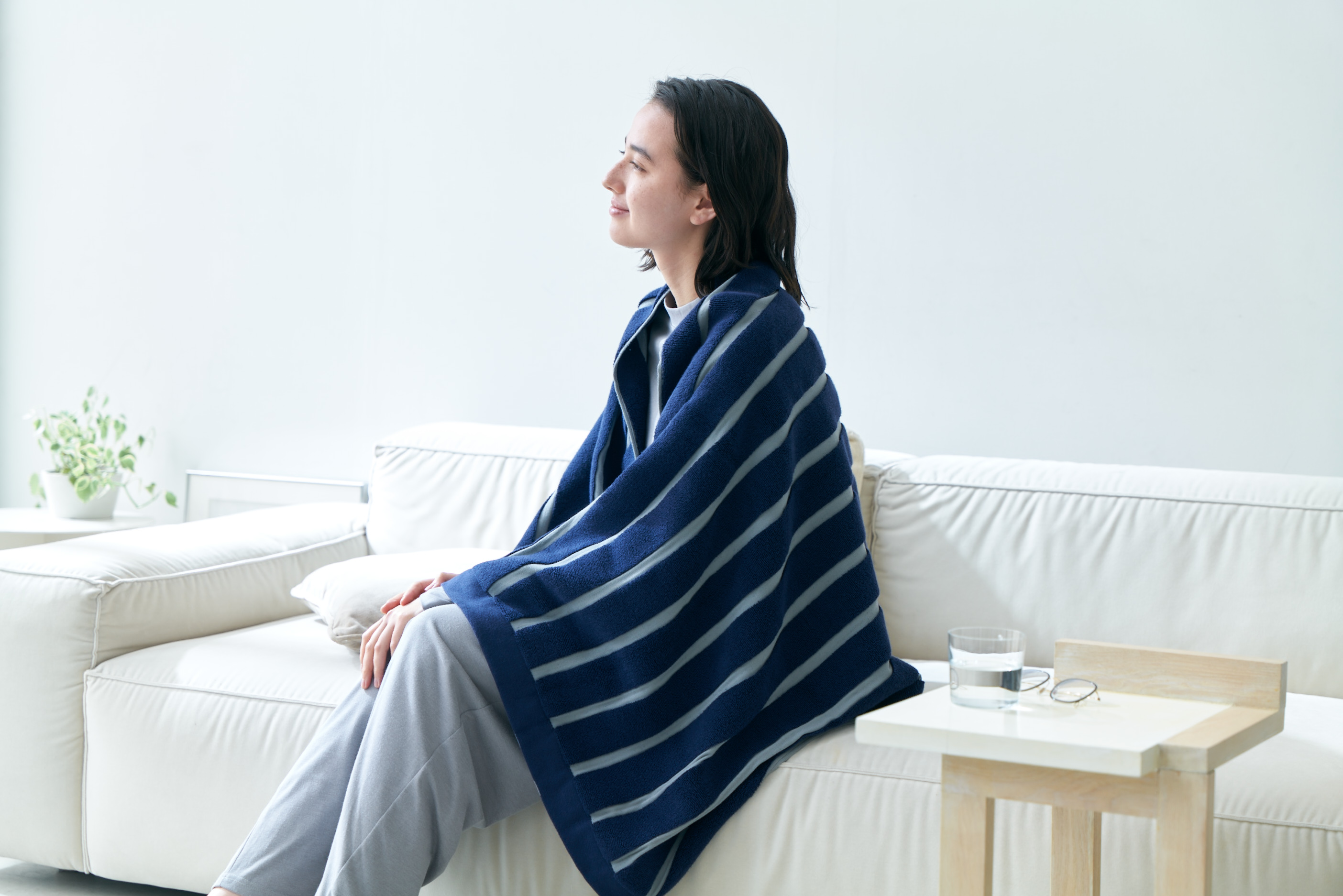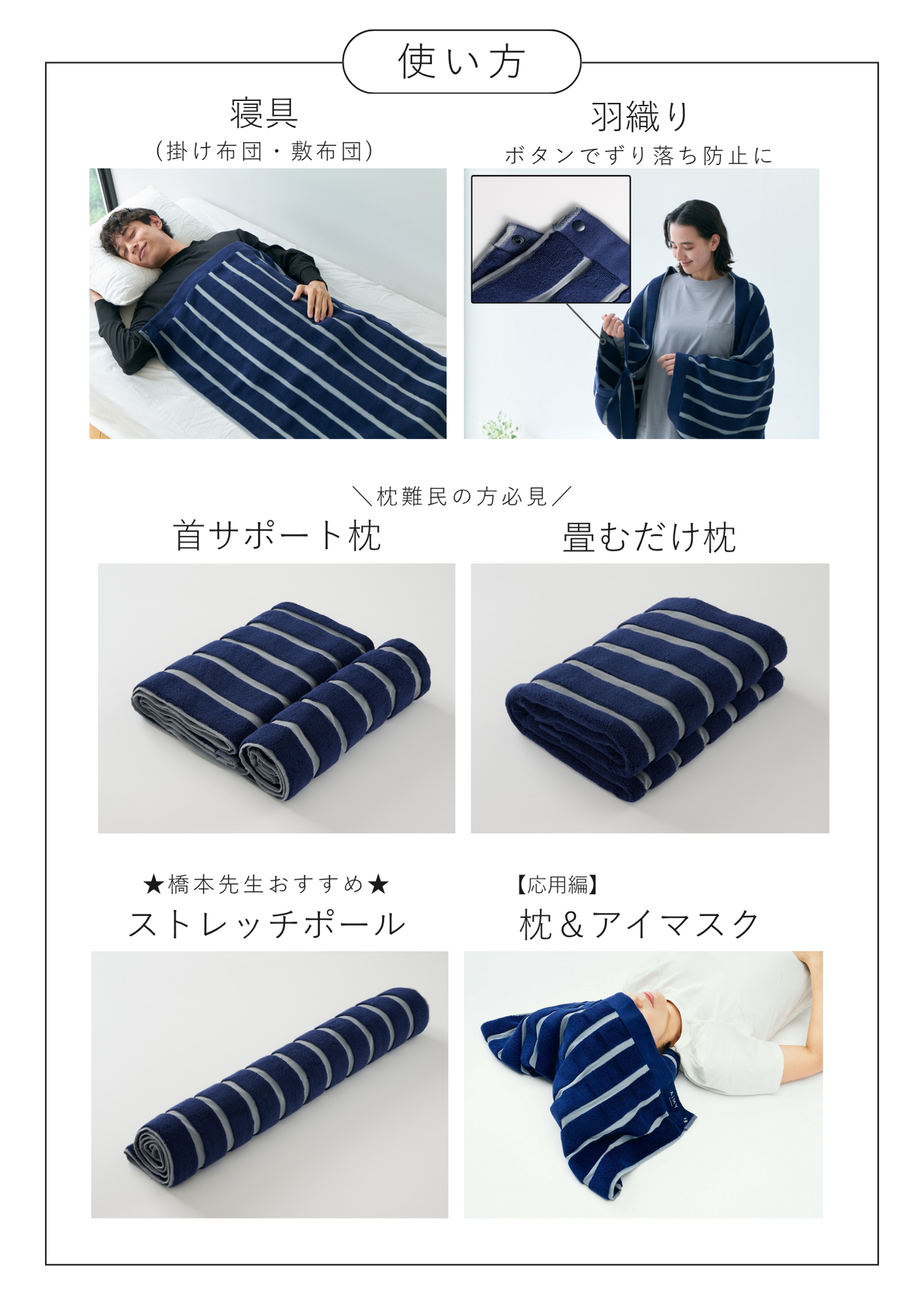 お客様のもとに届いてからは、オリジナルの使い方が広がっています。中でも、首の後ろでスナップボタンを留めると"着る毛布"に変わるのは、スタッフも実際に試してとても心地よく感じました。ぜひ皆さまのアイデアや使い方を、公式Instagram(@aimy.jp)からコメント等でお教えください!